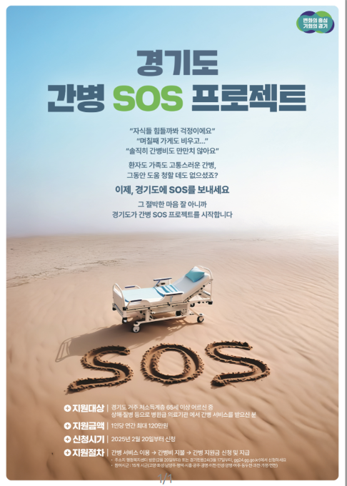 경기도가 간병의 어려움을 겪고 있는 노인들의 간병비 부담을 덜어주기 위해 횟수 제한 없이 1인당 연간 최대 120만원의 간병비를 지원하는 '경기도 간병 SOS 프로젝트'를 시행합니다.