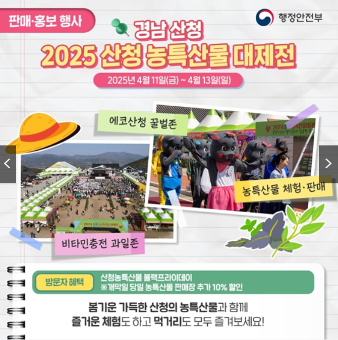 - 봄기운 가득한 산청의 농특산물과 함께 즐거운 체험도 하고 먹거리도 모두 즐겨보세요!