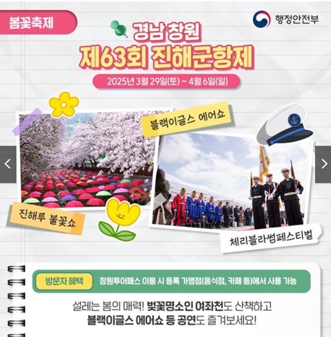- 설레는 봄의 매력! 벚꽃명소인 여좌천도 산책하고 블랙이글스 에어쇼 등 공연도 즐겨보세요!