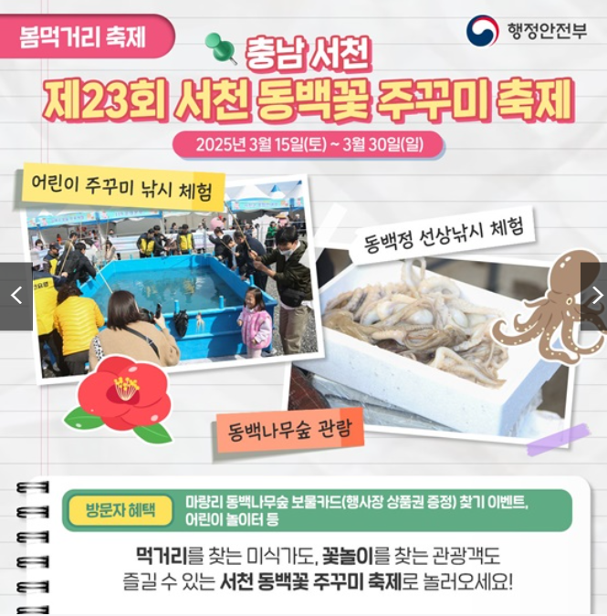 - 먹거리를 찾는 미식가도, 꽃놀이를 찾는 관광객도 즐길 수 있는 서천 동백꽃 주꾸미 축제로 놀러오세요!