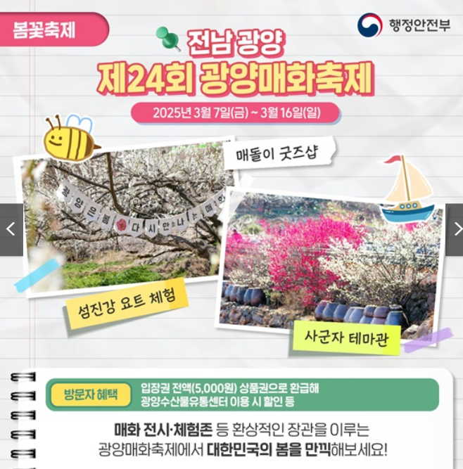 - 매화 전시·체험존 등 환상적인 장관을 이루는 광양매화축제에서 대한민국의 봄을 만끽해보세요!